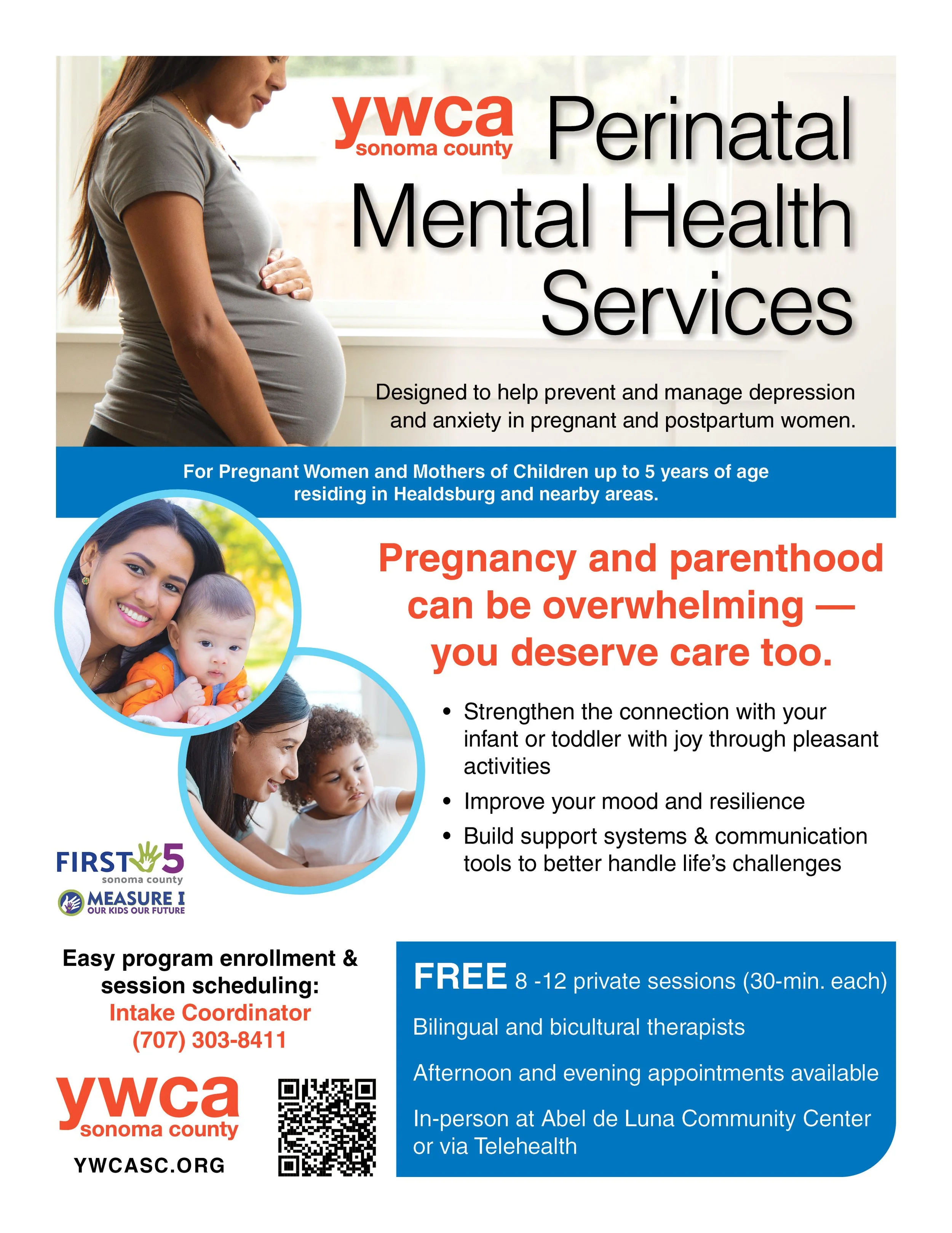 Centered around a woman’s journey to motherhood, YWCA’s Perinatal services support both pregnant and postpartum mothers with an emphasis on preventing depression and anxiety in pregnant and new mothers with children under the age of five years old. Participants receive 8 to 12 FREE private, one-on-one sessions (30 minutes each) with a bilingual, bicultural therapist. Sessions are offered in-person at the Abel de Luna Community Center or via Telehealth, with afternoon and evening appointments available.
